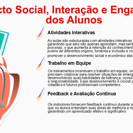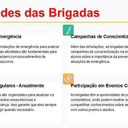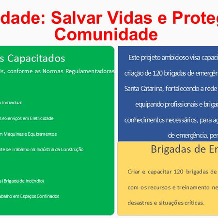 •Um aspecto inovador do projeto é a formação de "Brigadas de Emergência Mirim" nas escolas, capacitando crianças a lidarem com situações de emergência. Este treinamento inclui simulações, desenvolvimento de habilidades de liderança e conscientização sobre a prevenção de acidentes, promovendo um ambiente escolar seguro e solidário. Além disso, o projeto busca aumentar o engajamento dos pais e da comunidade na segurança e bem-estar dos trabalhadores e estudantes.