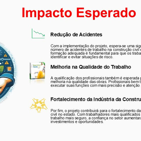 •Os acidentes são frequentemente atribuídos a fatores como falta de qualificação e não cumprimento das normas de segurança. Para mitigar esses riscos, o projeto oferece capacitação em temas como identificação de riscos, procedimentos seguros, manutenção de equipamentos de proteção, primeiros socorros e legislação pertinente. Entre os resultados esperados estão a redução de acidentes, fomentar a cultura de segurança no trabalho, escolas e comunidade.